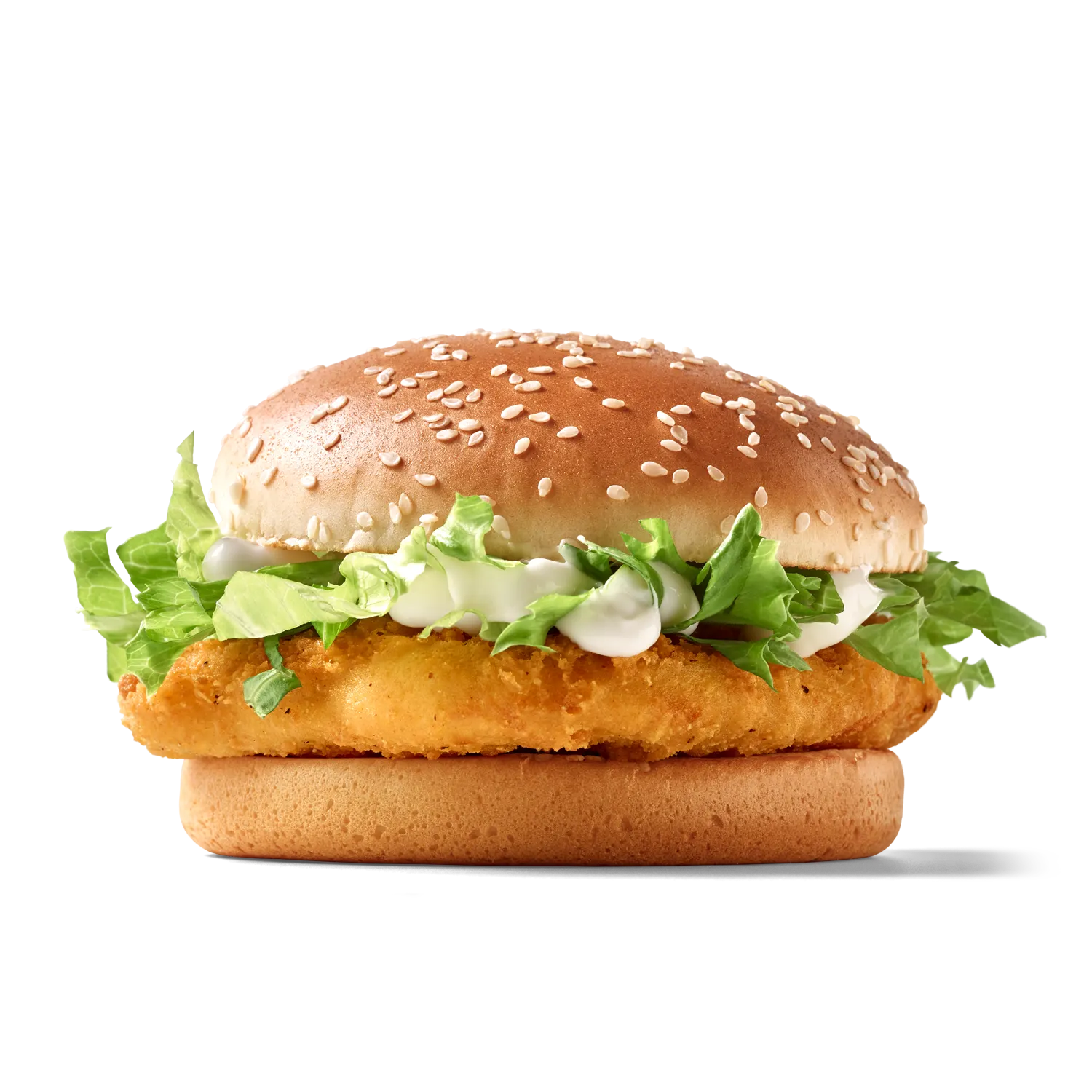 Pão brioche fofinho, 100g de frango empanado, alface americana e maionese defumada única. Sabor perfeito, receita produzida em 2099, aprecie.