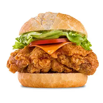 Pão brioche fofinho, 120g de sobrecoxa empanada, cheddar, alface americana, tomate e maionese defumada única. Sabor perfeito, receita produzida em 2099, aprecie.
